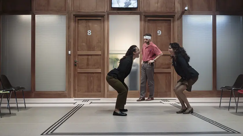 Così come molto immediato è il codice che si innesca con il pubblico: bastano un oggetto, un tratto dell’abbigliamento, pochissime parole, legate alla situazione – formule linguistiche di prassi, come i numeri che vengono chiamati e brevi frasi di circostanza e cortesia – e il tutto è comprensibile senza barriere linguistiche. In modo molto analogico, con uno strumento classico, un mattoncino essenziale dei meccanismi scenici qual è la porta, I Gordi rappresentano, traducendolo attraverso il teatro fisico, qualcosa di molto attuale.