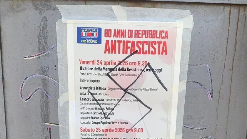 (ANSA) - NAPOLI, 26 APR - Ignoti hanno disegnato una svastica sulla porta d'ingresso della sede dell'Associazione Nazionale Partigiani d'Italia (Anpi) di Portici, in provincia di Napoli. La svastica è stata disegnata sul volantino con il quale l'associazione annunciava le iniziative in programma i festeggiamenti per gli "80 anni della Repubblica antifascista" che si sono concretizzati in città con due appuntamenti: un incontro al liceo scientifico Filippo Silvestri, venerdì, e sabato, in via San Cristoforo, la deposizione di una corona d'alloro in memoria del maresciallo medaglia d'oro al merito civile Ciro Siciliano, che si sacrificò per salvare dai nazisti la popolazione di Forno, nelle Alpi Apuane. (ANSA).