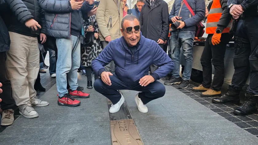 (ANSA) - SANREMO, 13 DIC - Il direttore artistico e conduttore dell'edizione 2026 del Festival di Sanremo (24-28 febbraio), Carlo Conti, ha partecipato nel pomeriggio alla posa sulla "walk of fame" sanremese di via Matteotti della targa dedicata al vincitore della scorsa edizione della gara canora: Olly, con il brano "Balorda Nostalgia". Ad attenderlo c'erano, oltre al sindaco della città dei Fiori, Alessandro Mager e all'assessore al Turismo, Antonio Sindoni, un folto gruppo di giornalisti e di curiosi, attratti dal capannello di gente attorno agli operai comunali, che stavano rimuovendo la griglia per inserire una nuova lastra commemorativa nella "walk of fame" sanremese, che prosegue fino al teatro Ariston. Conti ha poi invitato i presenti a intonare la canzone: "La dovreste cantare, ora", ha detto e, dando il classico "la" è partito con un "Vorrei, vorrei, vorrei…" a cui è seguito il coro di un gruppo di ragazzi: "Ci bastava, ridere, piangere, fare l'amore. E poi stare in silenzio per ore fino ad addormentarci sul divano...". Conti è in questi giorni, a Sanremo, per la selezione dei due vincitori assoluti di Area Sanremo, il concorso canoro che premia i due più meritevoli con un posto nella sezione Nuove Proposte del Festival. (ANSA).