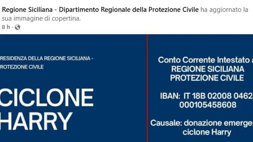 (ANSA) - CATANIA, 30 GEN - In Sicilia è stato attivano un conto corrente per donazioni a persone e attività colpite dal ciclone Harry. E' intestato a 'Regione Siciliana Protezione civile' con la causale: donazione emergenza ciclone Harry. L'Iban, pubblicato sulla pagina Facebook della Protezione civile regionale, è IT0200804625000105458608. (ANSA).