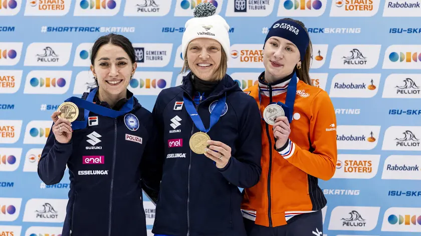 (ANSA) - ROMA, 18 GEN - Arianna Fontana regala il primo oro all'Italia dello short track agli Europei di Tilburg. L'olimpionica azzurra, che sarà portabandiera ai prossimi Giochi di Milano Cortina, ha vinto la prova dei 1500 metri davanti all'olandese Zoe Deltrap. Sul podio anche l'altra azzurra, Arianna Sighel, bronzo. (ANSA).