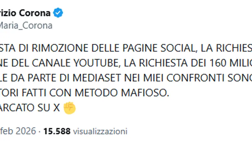 (ANSA) - MILANO, 06 FEB - "La richiesta di rimozione delle pagine social, la richiesta della rimozione del canale YouTube, la richiesta dei 160 milioni in sede civile da parte di Mediaset nei miei confronti sono atti intimidatori fatti con metodo mafioso. Sono sbarcato su X". Con questo messaggio Fabrizio Corona ha aperto un profilo sull'ex Twitter di Elon Musk. Apertura annunciata poco prima su una chat di Telegram, in cui ha scritto "sono atterrato su X". Intanto, il profilo che era riuscito ad aprire ancora una volta su Instagram è stato di nuovo rimosso. Corona ha già iniziato a postare su X una serie di messaggi con cui dice, in sostanza, che "non si fermerà" e altri attacchi a Mediaset. (ANSA).