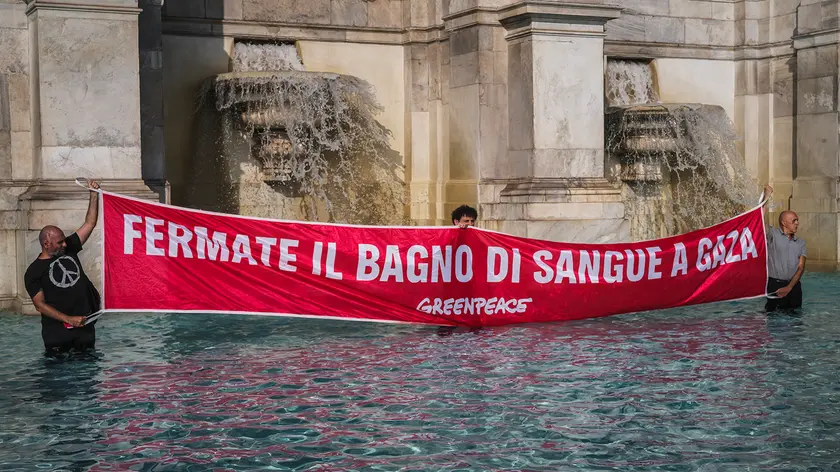 Greenpeace, striscione rosso sangue per Gaza a fontana Gianicolo