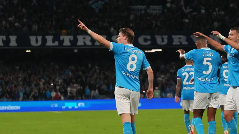 (ANSA) - NAPOLI, 25 OTT - Il Napoli si aggiudica il big match contro l'Inter e si riprende la vetta solitaria di Serie A, in attesa della Roma che domani giocherà a Sassuolo. La squadra di Conte si è imposta per 3-1 in una partita ricca di capovolgimenti di fronte e giocata a viso aperto da entrambe le squadre. Poco dopo la mezz'ora del primo tempo De Bruyne sblocca il risultato e porta i padroni di casa sull'1-0: curiosamente nell'azione del rigore si infortuna Mkhitaryan, mentre il belga è costretto a lasciare il campo per un problema muscolare dopo aver calciato il penalty. I nerazzurri vanno vicini al pareggio con Bastoni che colpisce una traversa e Dumfries il cui tiro è fermato dal palo. In avvio di ripresa il raddoppio di McTominay. La gara si riapre grazie ad un rigore trasformato dallo specialista Calhanoglu per l'Inter. Al 66' arriva però il gol di Anguissa che fissa il risultato sul 3-1 per il Napoli. (ANSA).