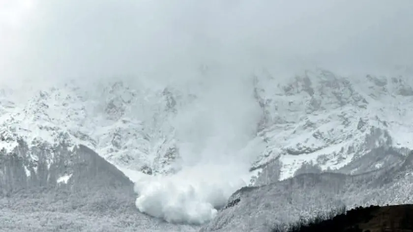 (ANSA) - ISOLA DEL GRAN SASSO D'ITALIA, 10 GEN - Spettacolare quanto drammatica l'immagine, diventata virale sui social in poche ore, che ritrae un imponente distacco di neve al limite del bosco sottostante il Paretone del Corno Piccolo del Gran Sasso d'Italia, sul versante che sovrasta la Valle Siciliana e Isola del Gran Sasso, in provincia di Teramo, in particolare. La foto della slavina, postata da Leonardo Visconti ferma l'enorme nuvola che accompagna la discesa della valanga nell'impatto sul limite del bosco. La zona è disabitata e selvaggia e al momento non si registrano notizie circa il coinvolgimento di persone nell'evento. (ANSA).