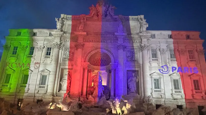 La Fontana di Trevi illuminata con le bandiere di Francia e Italia