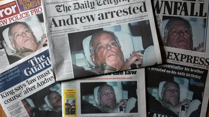 (ANSA) - LONDRA, 20 FEB - E' l'immagine del viso dell'ex principe Andrea con l'espressione stravolta, dopo il rilascio seguito ieri sera al fermo di 12 ore cui il fratello di re Carlo III è stato sottoposto dalla polizia britannica che lo indaga nell'ambito in relazioni ai rapporti con il defunto finanziere pedofilo americano Jeffrey Epstein, a dominare oggi tutte le prime pagine dei giornali del Regno: uniti, dalla stampa più autorevole a quella più sensazionalista, a sottolineare l'arresto del terzogenito di Elisabetta II come un evento sismico di portata storica, a puntare il dito contro di lui - tuttora sulla carte ottavo per diritto di sangue nella linea di successione alla corona - e a proiettare ombre allarmanti sullo stesso futuro della monarchia. Fra i tabloid spicca il titolo irridente del Sun sotto la foto di Andrew Mountbatten-Windsor colto dai flash con gli occhi sbarrati mentre rientra a casa dopo l'arresto nel giorno del 66esimo compleanno e il rilascio: "Ora suda". Un riferimento all'improbabile alibi che l'ex duca di York aveva tirato fuori - sostenendo d'aver sofferto in passato di una sindrome che gli avrebbe impedito di sudare, contratta ai tempi della sua missione di guerra nel conflitto con l'Argentina per le isole Falkland-Malvinas - durante un'intervista-boomerang alla Bbc del 2019 per contestare le accuse di Virginia Giuffre, una delle vittime del giro di giovani sfruttate da Epstein e da Ghislaine Maxwell a beneficio proprio o di amici ricchi e potenti, che denunciava d'essere stata indotta ad avere rapporti sessuali con lui a 17 anni almeno tre volte. E ricordava come Andrea "sudasse copiosamente". Molti giornali, dal Guardian al Mail puntano invece sulle parole con cui re Carlo sembra aver preso definitivamente le distanze dal fratello, limitandosi a sottolineare dopo il fermo che "la legge deve fare il suo corso". Parole che non impediscono peraltro ad alcuni commentatori di evocare gli imbarazzi e i rischi che il sovrano 77enne ha ancora di fronte, mentre le indagini potrebbero far emergere ulteriori dettagli sulle coperture garantite in passato dalla famiglia reale al reprobo. Imbarazzi che secondo qualcuno potrebbero suggerire prima o poi a Carlo un passo indietro a beneficio del suo primogenito ed erede al trono William, presentato da una parte dell'establishment come inflessibile sul destino di Andrea: almeno negli ultimi tempi. (ANSA).