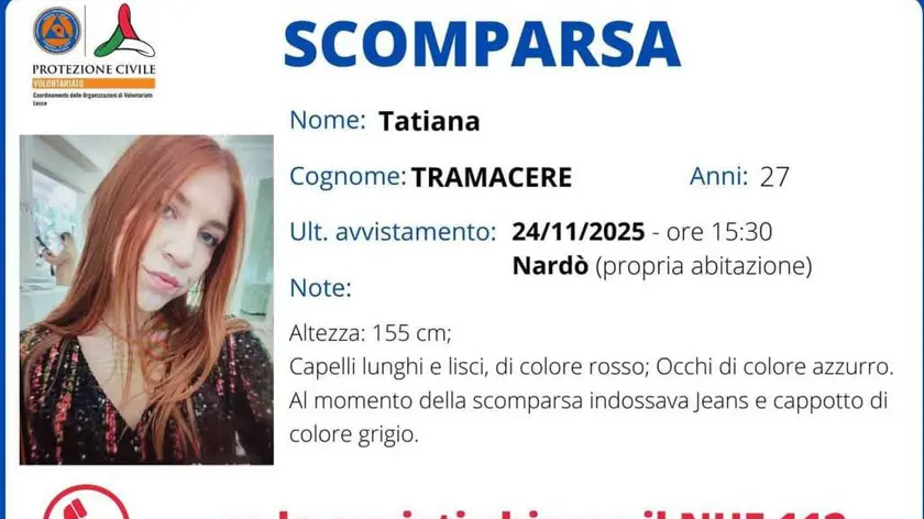 (ANSA) - NARDÒ, 02 DIC - Continuano senza sosta e senza alcun esito, anche oltre i confini regionali, le ricerche di Tatiana Tramacere, la ragazza che vive a Nardò, in provincia di Lecce, e di cui non si hanno più notizie da lunedì 24 novembre. A quanto si apprende, il telefono della giovane risulta spento. Al momento gli investigatori stanno lavorando su più piste, ascoltando anche amici e parenti della 27enne, e analizzando ogni dettaglio che sta emergendo da queste testimonianze. Resta sempre viva l'ipotesi di un allontanamento volontario di Tatiana Tramacere, che lavora nel mondo digitale occupandosi di pubblicità. Le sue pagine social sono molto seguite, con migliaia di followers: anche questi elementi sono al centro dell'attività dei carabinieri. "Tatiana non si allontana mai senza avvisare la famiglia. Per questo - scrive il sindaco di Nardò Pippi Mellone sulla propria pagina social - la preoccupazione cresce di ora in ora. Le ricerche continuano senza sosta. La Prefettura e le forze dell'ordine stanno controllando tutto il territorio. Se l'avete vista o avete informazioni chiamate subito il 112. Anche un piccolo dettaglio può fare la differenza". (ANSA).