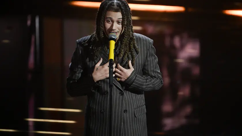 (ANSA) - SANREMO, 24 FEB - Tailleur doppio petto rigato marrone, con cravatta di pelle. Sayf è il terzo cantante in gara a Sanremo ed arriva sul palco con un solo anello. Nelle ore scorse si era discusso sui social per i gioielli che l'artista indossava sul green carpet, ovvero una collana, un paio di orecchini e un bracciale dalla collezione griffata disegnata da Pharrell Williams, molto costosi, anche se mimetizzati sotto un'abbondante pelliccia. Dopo l'applaudita esibizione con la sua Tu mi piaci tanto, esce salutando la mamma e il papà. (ANSA).