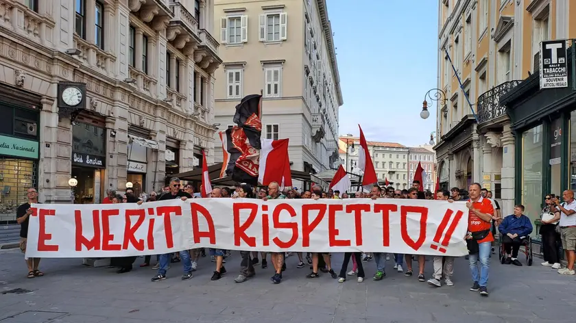 (ANSA) - TRIESTE, 05 GIU - Un centinaio di tifosi della Triestina hanno manifestato questa sera per protestare contro il rischio di fallimento che sta correndo la società sportiva. Sventolando bandiere biancorosse, i simpatizzanti sono sfilati in un corteo aperto da un grande striscione con la scritta "Trieste merita rispetto", per le strade del centro fino in piazza Unità d'Italia, davanti alla sede del Comune. Qui hanno acceso alcuni fumogeni di colore rosso e urlato che la Triestina non può fallire. Dal Palazzo sono usciti molti esponenti della maggioranza di centrodestra, conclusi per oggi i lavori del Consiglio comunale sulla variante al Piano regolatore per l'impianto di ovovia da realizzare, esprimendo solidarietà ai tifosi. Se la situazione sportiva non è cattiva visto che la squadra si è salvata dalla retrocessione dal campionato di serie C, a preoccupare è invece la situazione economica: entro domani l'a.d. Sebastiano Stella e il presidente, lo statunitense Ben Rosenzweig, dovranno iscrivere la squadra al campionato di C, appunto. E sistemare anche una serie di adempimenti come la convenzione per lo stadio, fideiussione da 700 mila euro, il piano di rateizzazione con l'erario per il pregresso. Voci vicine alla società ipotizzano un prestito (occorrerebbero circa 5 milioni di euro) oppure la cessione a un nuovo soggetto che si accollerebbe squadra, società e tutti i problemi. La Triestina, società storica in Italia, da anni attraversa gravi problemi e ciclicamente si è trovata a un passo dal fallimento. (ANSA).