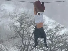 Il 32enne aggrappato a un cavo prima della caduta e la rete di protezione della seggiovia