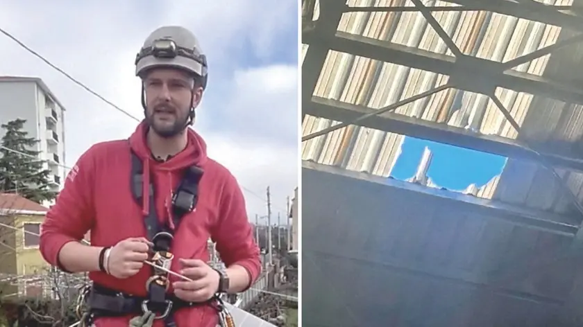 Tommaso Enzo Andreuzza e, a destra, la sezione di tetto crollata