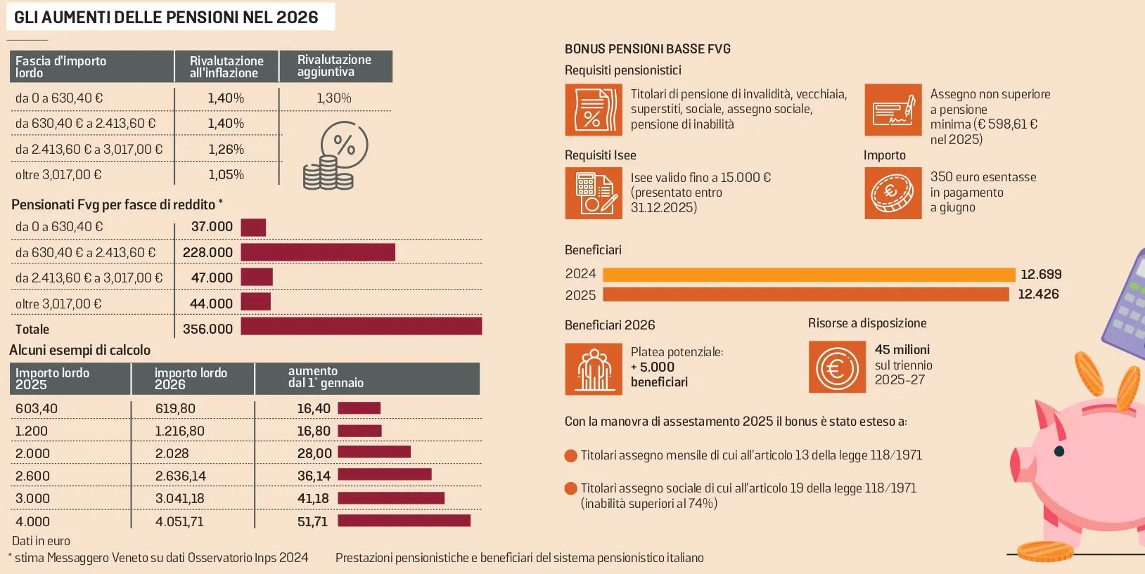 Sempre sulla base dell’Osservatorio Inps sulle pensioni, sotto la soglia dei 2.400 euro si colloca oltre il 70 per cento dei pensionati del Friuli Venezia Giulia, 265 mila su un totale di 356 mila. Tra questi sono circa 37 mila, come detto, quelli titolari di importo pari o inferiore al minimo, che si sono visti confermare quest’anno, oltre all’aumento Istat dell’1,4 per cento, anche la rivalutazione extra dell’1,3 per cento, già erogata nel 2025 e pertanto non percepita come aumento (da qui un importo effettivo in pagamento, per le minime, di 619,80 euro, più alto di quello di legge).