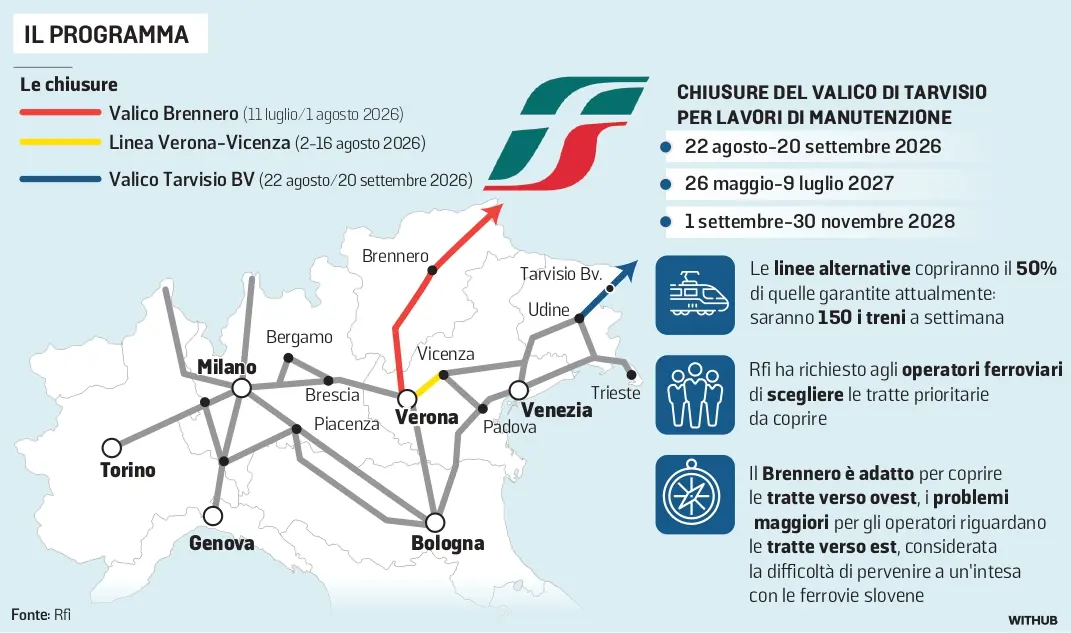 Le linee alternative copriranno il 50% di quelle garantite attualmente, ovvero saranno 150 i treni a settimana. Il Brennero è adatto per coprire le tratte verso ovest, le preoccupazioni principali degli operatori riguardano le tratte verso est stante la difficoltà nel trovare un’intesa per utilizzare la rete delle ferrovie slovene. «Le interruzioni programmate tra metà agosto e metà settembre lungo la linea ferroviaria Udine-Tarvisio impongono una gestione preventiva e condivisa dell’impatto sul traffico merci, oltre che su quello passeggeri – ha dichiarato Amirante –. Per quanto riguarda il segmento cargo, l’alternativa dovrà necessariamente essere individuata lungo l’asse del Brennero. Per questo abbiamo convocato un confronto, che si è dimostrato molto utile, così da definire per tempo soluzioni operative in grado di garantire continuità ai flussi logistici del Friuli Venezia Giulia».