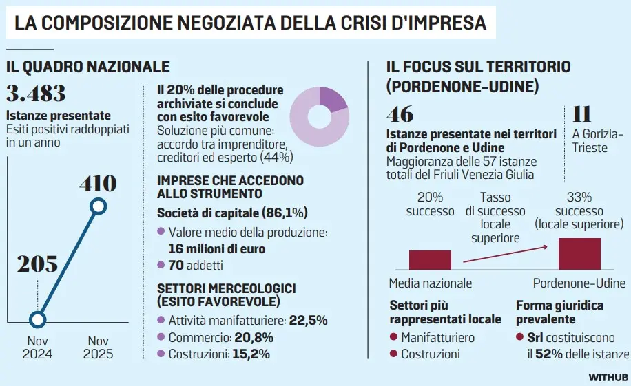 Vediamo allora un po’ di numeri. Parallelamente alla crescita delle domande, a livello nazionale è raddoppiato il numero dei casi di successo, passando da 205 (novembre 2024) a 410 (novembre 2025). Il tasso di successo medio dell’istituto a livello Italia si è attestato al 22% a partire dal 1° gennaio 2025, raggiungendo il 25% nel terzo trimestre del 2025. Nelle aree di Pordenone e Udine, a fronte di 22 istanze concluse a oggi, 7 hanno avuto esito positivo e 15 negativo, mentre nella Venezia Giulia su 11 ben 4 sono state risolte in modo favorevole.