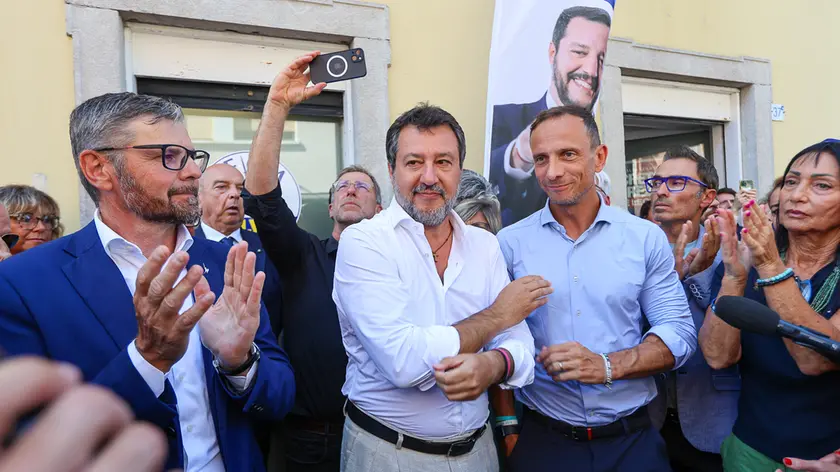 Salvini e Fedriga davanti alla sede regionale di Udine (foto Petrussi)