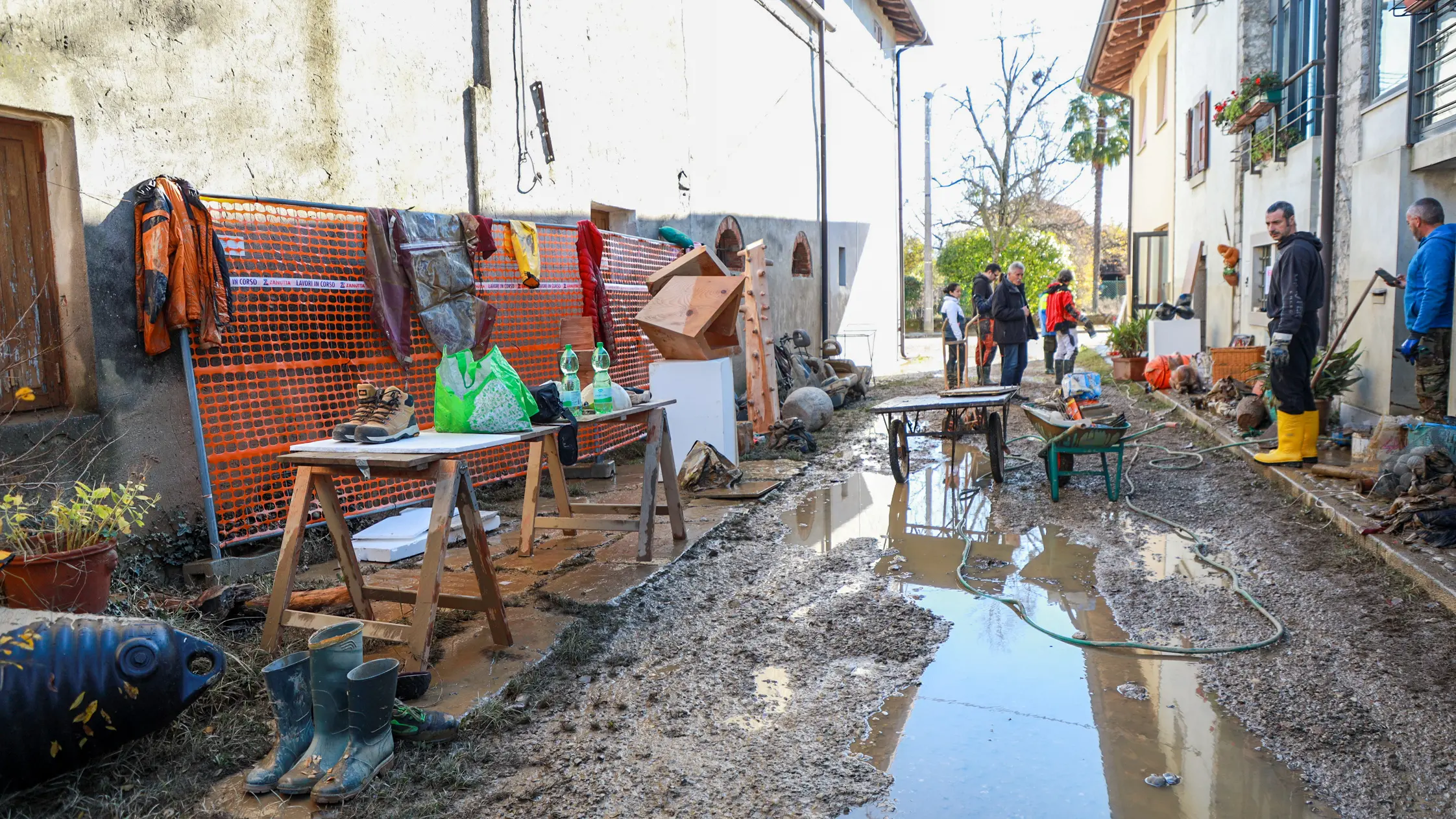 Numerosi compaesani stanno aiutando la vedova di Kuhnert nello svuotare dall'acqua il negozio di enogastronomia che la coppia, di origine tedesca, aveva rilevato nel febbraio scorso, cercando di offrire un servizio all'antica borgata.