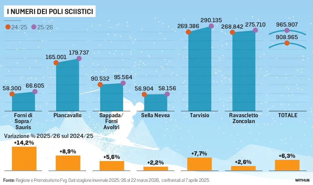 I primi ingressi, su base tendenziale, sono aumentati del 14,2 per cento a Forni di Sopra-Sauris, dell’8,9 per cento a Piancavallo, del 5,6 per cento a Sappada-Forni Avoltri, del 2,2 a Sella Nevea, del 7,7 a Tarvisio e del 2,6 per cento nel comprensorio Ravascletto-Zoncolan. «Stiamo investendo da tempo risorse come mai è stato fatto in Fvg nelle campagne promozionali, con effetti positivi su corregionali, turisti italiani e stranieri», ha detto l’assessore.