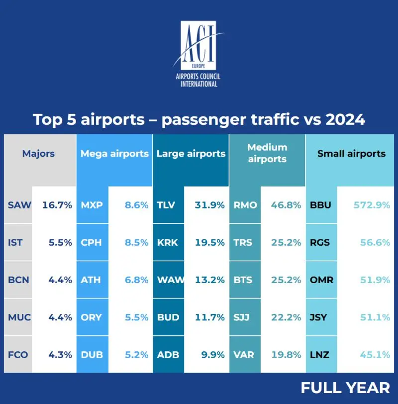 L’Aci (Airport Council International) Europe ha infatti pubblicato i top 5 airports per crescita di traffico per l’anno 2025 confrontando i dati di traffico dell’anno precedente.