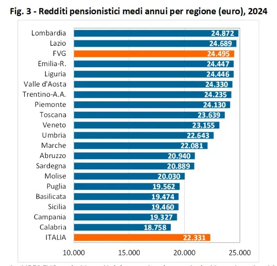 Nel 2024 (anno a cui si riferisce l’indagine dell’Ires) il reddito medio pensionistico (lordo) in regione era di 24.495 euro all’anno (decisamente superiore al dato nazionale pari a 22.331), un valore che pone il Friuli Venezia Giulia al terzo posto dopo Lombardia (24.872) e Lazio (24.689). Nelle ultime posizioni si trovano le regioni del Sud, in particolare Puglia, Basilicata, Sicilia, Campania e Calabria, tutte con importi medi inferiori a 20 mila euro.