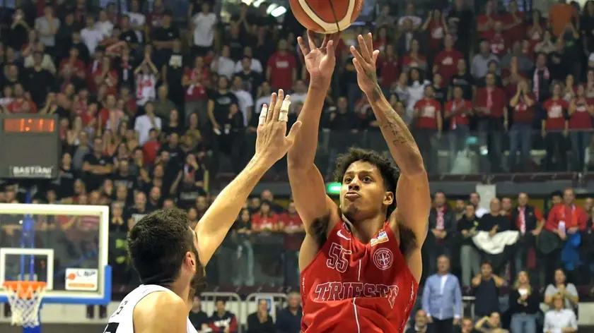 Eli Brooks scocca la tripla che ha deciso il derby con Udine al PalaTrieste foto Bruni