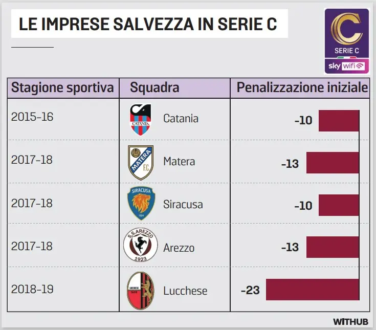 In C tra gli innumerevoli casi si ricorda il Catania, per due stagioni di fila nel 2016 e 2017 salvo con 10 e 7 punti di penalità. L’anno scorso le imprese di Triestina e Lucchese trovarono similitudini con diverse altre situazioni, vissute negli ultimi 10 anni da società come Siracusa, Santarcangelo, Barletta, Ravenna. Anche i casi apparentemente più clamorosi non sono paragonabili all’eventuale salvezza dell’Unione. Nel 2018 Matera e Siracusa si salvarono con –13 e –10 facendo sul campo 55 punti, ed evitarono i play-out complice anche la radiazione dell’Akragas.