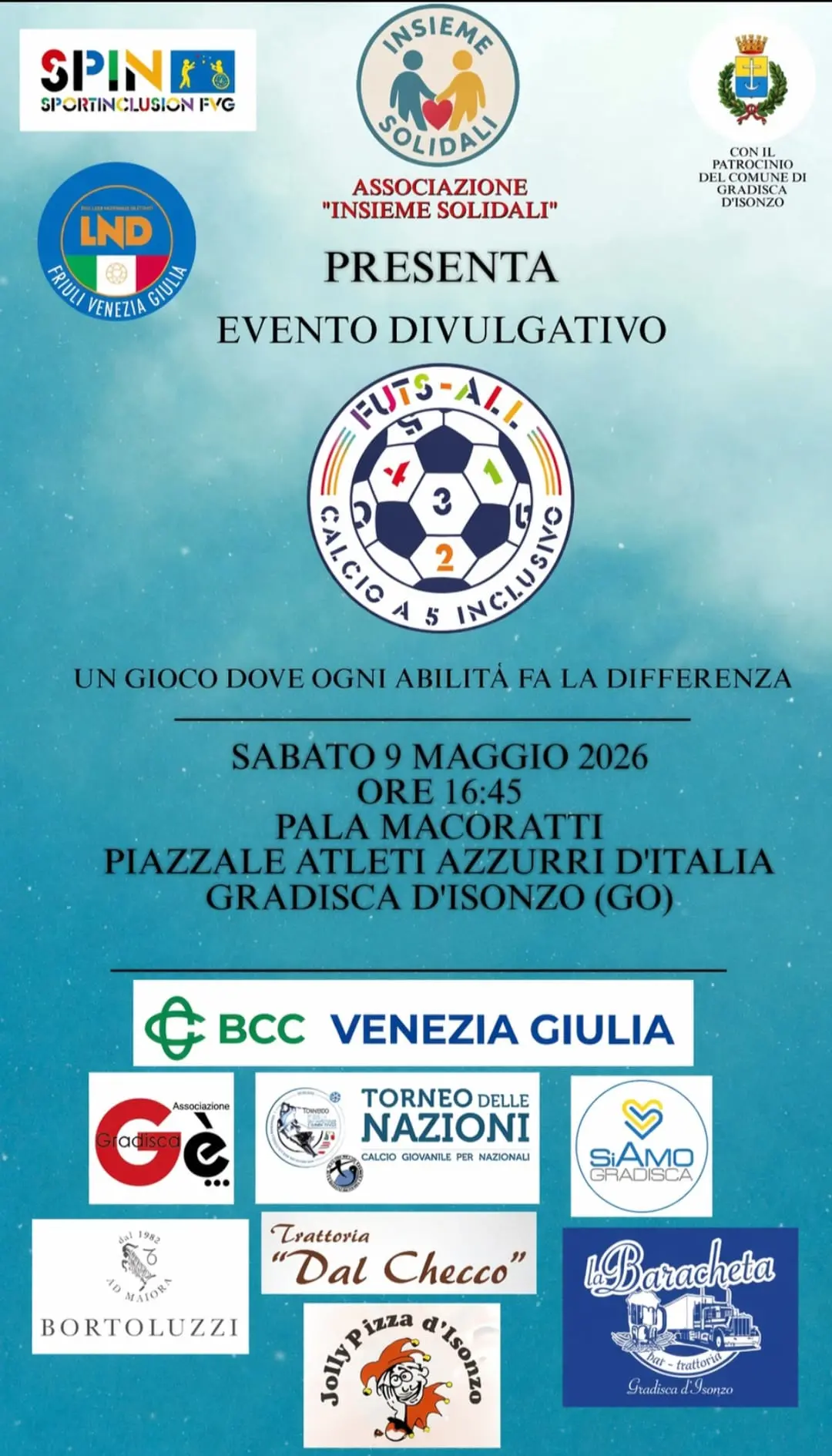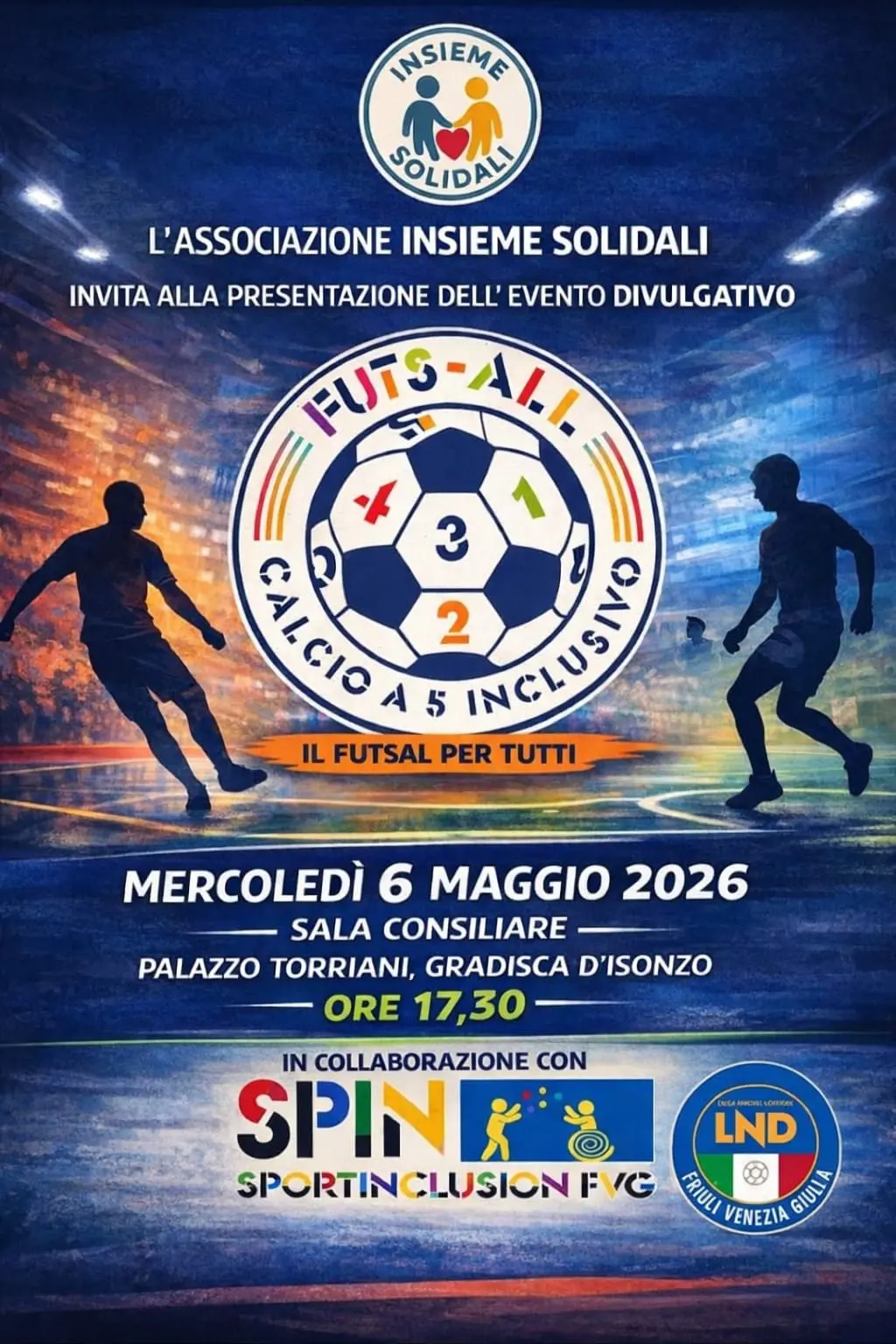 L’associazione di volontariato “Insieme Solidali” ha messo in calendario tre eventi per la prima parte del 2026, a cominciare appunto da quello del 9 maggio, al Palamacoratti di Gradisca d’Isonzo, con un evento di Futs-all, il cui campionato sperimentale Figc Lnd Fvg è unico in Italia. La seconda tappa sarà un Torneo di calcio a 7, i cui proventi saranno devoluti alla ricerca, in particolare al progetto “Potenziale patogenetico delle fibre di asbesto” della dottoressa Violetta Borelli di Trieste. A chiudere il trittico ci sarà la lotteria di Ferragosto, con estrazione il 22 agosto e il cui ricavato sarà devoluto al progetto “Io tifo Sveva” del reparto di oncologia pediatrica dell’ ospedale Burlo di Trieste.