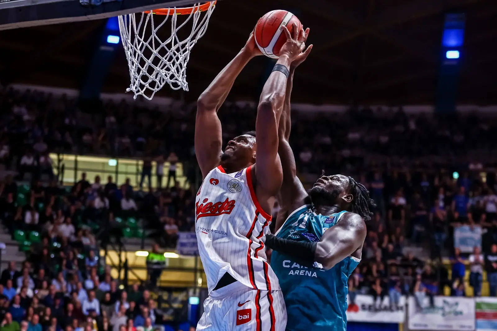 Pallacanestro Trieste: Ross 8 (1/2, 1/4), Ramsey 11 (3/5, 1/7), Deangeli 4 (2/4, 0/2), Uthoff 3 (0/3, 1/3), Sissoko 5 (2/5). Ruzzier 3 (1/1, 0/2), Toscano-Anderson 10 (5/5, 0/4), Bannan 22 (5/9, 2/2), Candussi 10 (1/3, 2/5). Ne: Iannuzzi, Cinquepalmi, Martucci. All. Taccetti.