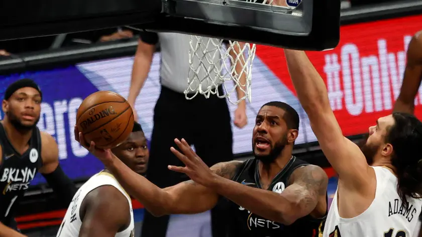 epa09121561 Brooklyn Nets center LaMarcus Aldridge (C) looks to put up a shot past New Orleans Pelicans forward Zion Williamson (L) and teammate New Orleans Pelicans center Steven Adams (R) in the first half of the NBA basketball game between the New Orleans Pelicans and the Brooklyn Nets at the Barclays Center in Brooklyn, New York, USA, 07 April 2021. EPA/JASON SZENES SHUTTERSTOCK OUT