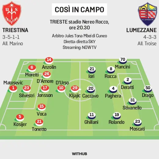 Se passerà già a tre in difesa, Marino potrebbe utilizzare Silvestri, Moretti e Kosijer, se Anzolin gli servirà per fare il quinto (con Tonetto dal lato opposto). A centrocampo ci saranno Jonsson, Voca e probabilmente D’Amore, poi davanti forse D’Urso e uno fra Kljajic e Faggioli.
