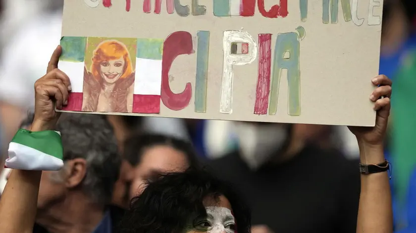 epa09326565 An Italy fan holds a sign dedicated to late Italian singer and actress Raffaella Carra before the UEFA EURO 2020 semi final between Italy and Spain in London, Britain, 06 July 2021. EPA/Frank Augstein / POOL (RESTRICTIONS: For editorial news reporting purposes only. Images must appear as still images and must not emulate match action video footage. Photographs published in online publications shall have an interval of at least 20 seconds between the posting.)