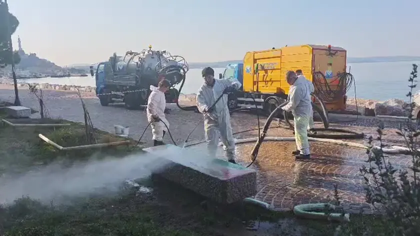 Bandiere ProPal disegnate sulle panchine di Barcola, idropulitrici in azione per pulirle